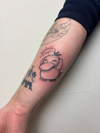 Da ich noch Auszubildende bin variiert mein Stil immer wieder und entwickelt sich stetig weiter. Am liebsten arbeite ich mit dickeren Linien und Pepper Shading und nutze auch Elemente aus dem Bereich Traditional/Neotraditional. Es darf gerne düsterer/morbider werden aber auch humoreske/skurrile Designs habe ich schon umgesetzt. Ich bin also erstmal offen für alle Ideen und auch mit Farbe möchte ich zukünftig arbeiten. Was ich eher nicht mache sind Fineline-Motive und Fineline-Letterings.